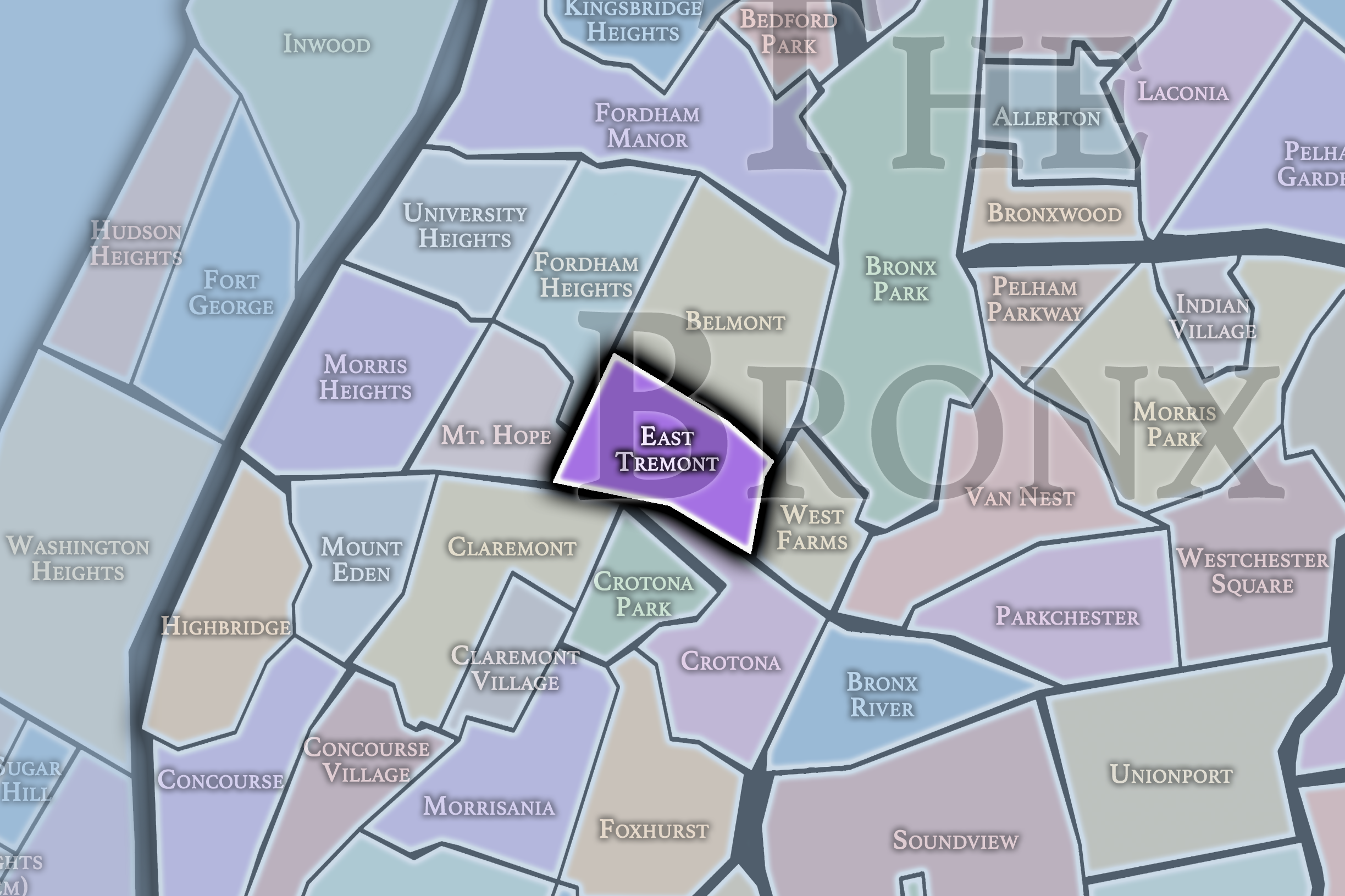 Bounded by the Cross Bronx Expressway to the south, Webster Avenue to the west, East 180th Street to the north, and Southern Boulevard to the east, East Tremont occupies the central spine of the Bronx—an energetic, densely built neighborhood wedged between the green slopes of Bronx Park and the industrial valleys of West Farms. Its position astride the Tremont Avenue corridor, historically one of the borough’s major east–west routes, gives it both its name and its pulse. The area’s grid of Tremont Avenue, Crotona Avenue, Arthur Avenue, and Bathgate Avenue supports a patchwork of prewar apartment buildings, rowhouses, and mid-century infill housing, forming a quintessential Bronx streetscape of stoops, corner stores, and close-knit blocks.