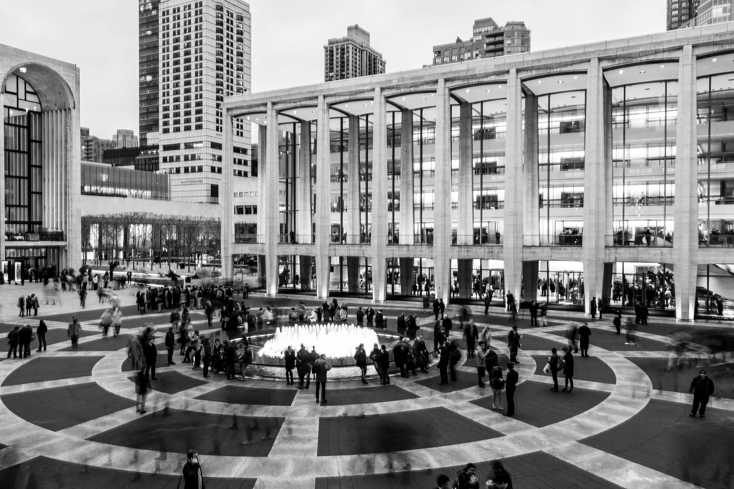 Construction of Lincoln Center for the Performing Arts began in 1959. Designed by a consortium of architects including Wallace Harrison, Philip Johnson, and Eero Saarinen, it comprised a constellation of buildings arranged around a monumental plaza and fountain. The Metropolitan Opera House, David Geffen Hall (formerly Philharmonic Hall), David H. Koch Theater (formerly New York State Theater), and the Juilliard School formed the nucleus of this new cultural district.