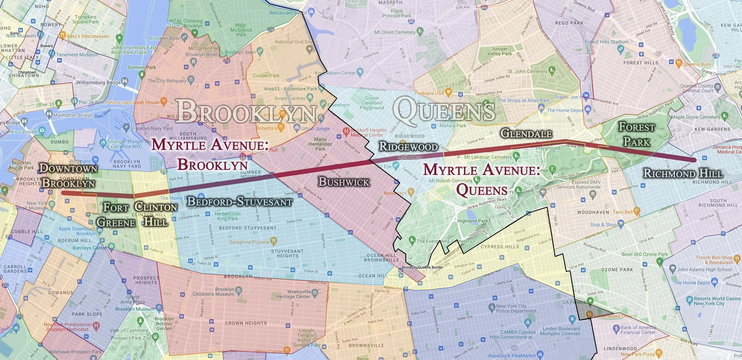 Myrtle Avenue runs like a historic current through the heart of Brooklyn and western Queens—an east–west spine stretching nearly 8 miles, from the Brooklyn waterfront in DUMBO to Jamaica Avenue in Richmond Hill. Beginning near Jay Street and Flatbush Avenue Extension, it travels eastward through Fort Greene, Clinton Hill, Bedford-Stuyvesant, Bushwick, and Ridgewood, before crossing into Glendale and Richmond Hill, Queens. Along its route, the avenue weaves together some of New York’s oldest industrial corridors, most architecturally rich brownstone districts, and most culturally dynamic neighborhoods.
