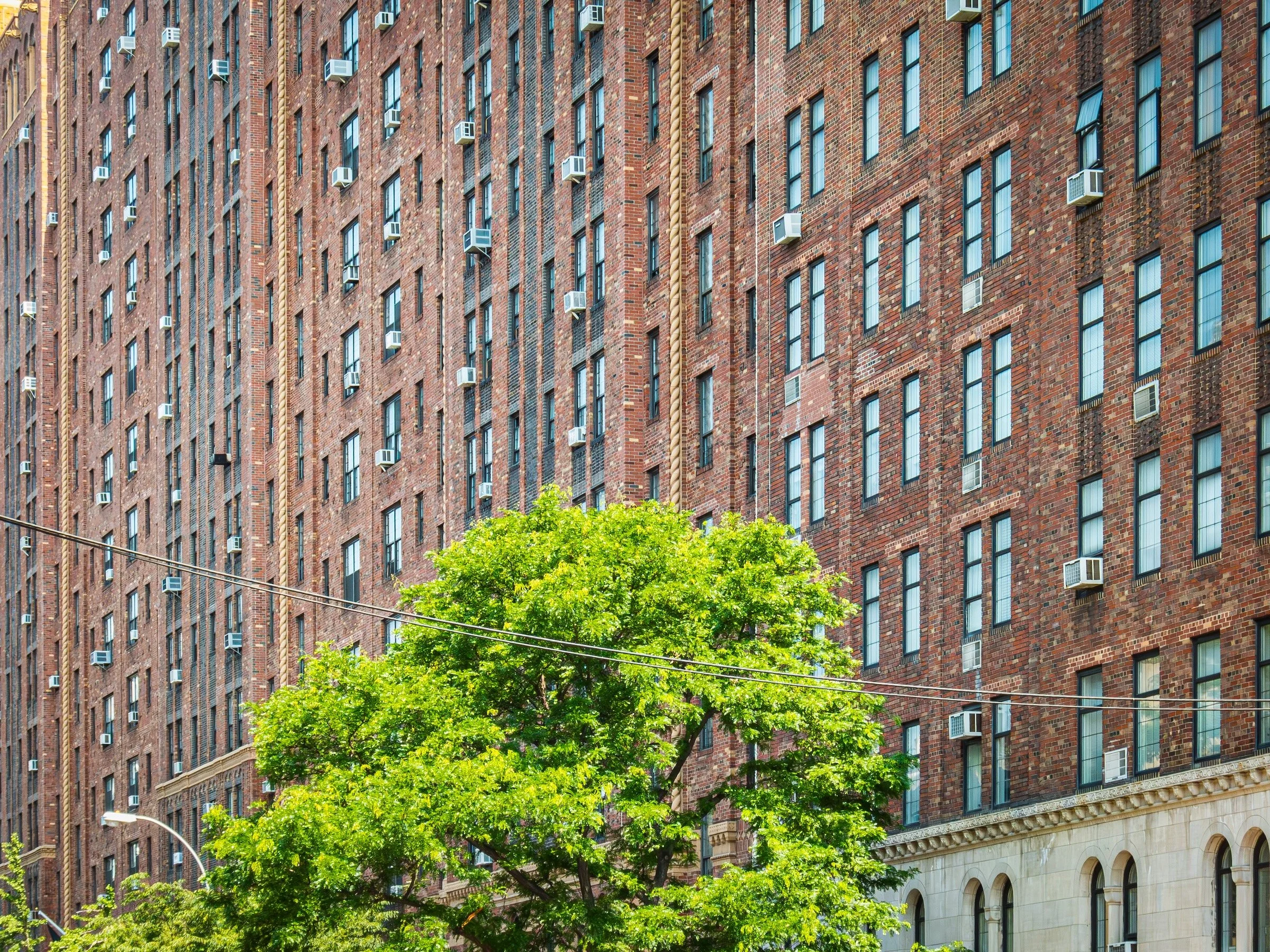 This is pure scale-as-pressure: a sheer wall of windows and brick that dominates the composition. Keep verticals clean here—small tilts make big buildings feel sloppy instead of monumental.