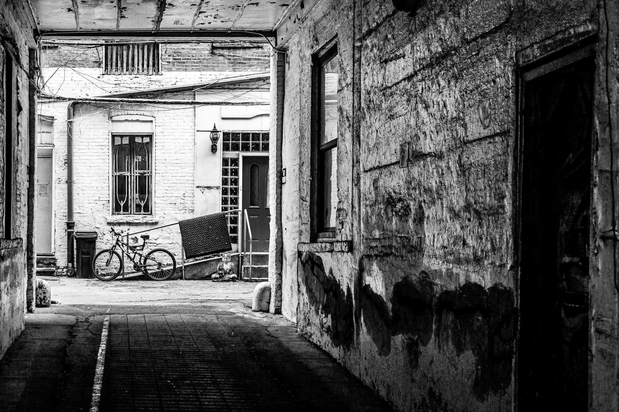 A hard-edged corridor frame turns an ordinary passage into a funnel of attention. Even before the viewer knows what they’re looking for, the frame tells them: look through here; something matters on the other side.