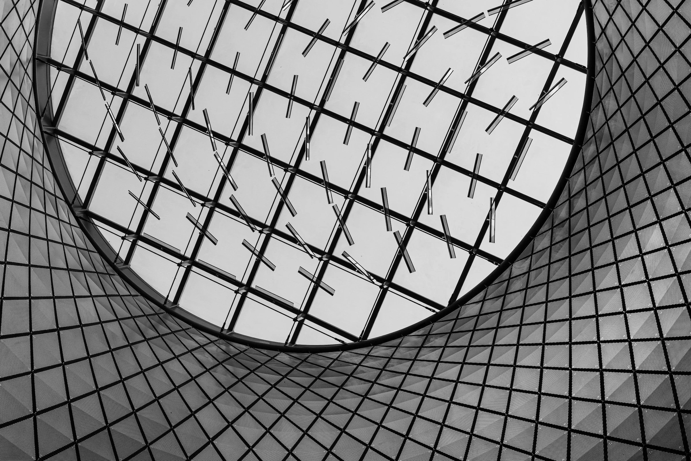 Here the geometry feels almost architectural calligraphy: crisp angles and repeating structural elements that make the building read like a constructed drawing. This is a great place for black-and-white, because it emphasizes the logic of the forms over the distraction of color.