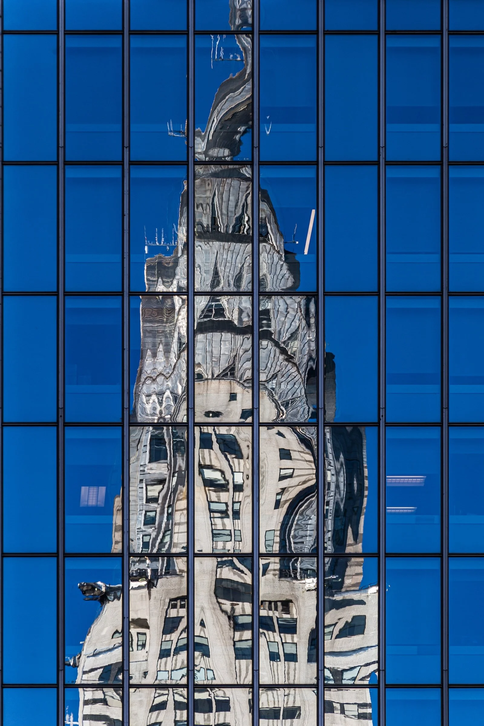 Big modern surfaces that don’t just reflect — they remix. The warped grid and scale shifts turn the skyline into a living abstraction.