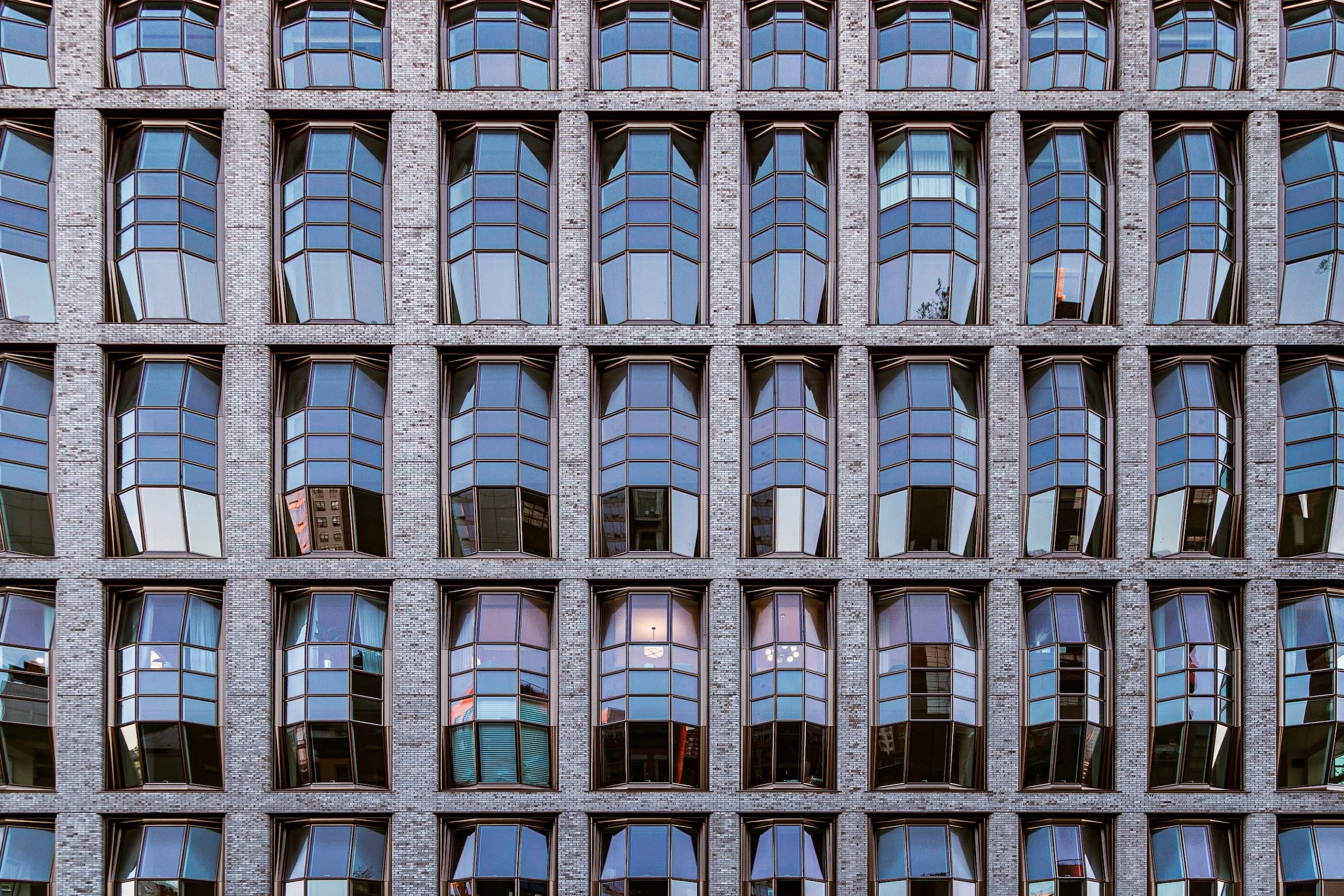 A street wall of repeated living units—windows, bays, and stacked verticals that turn the building into a rhythm instrument. Even small variations (curtain tones, slight setbacks) become accents.