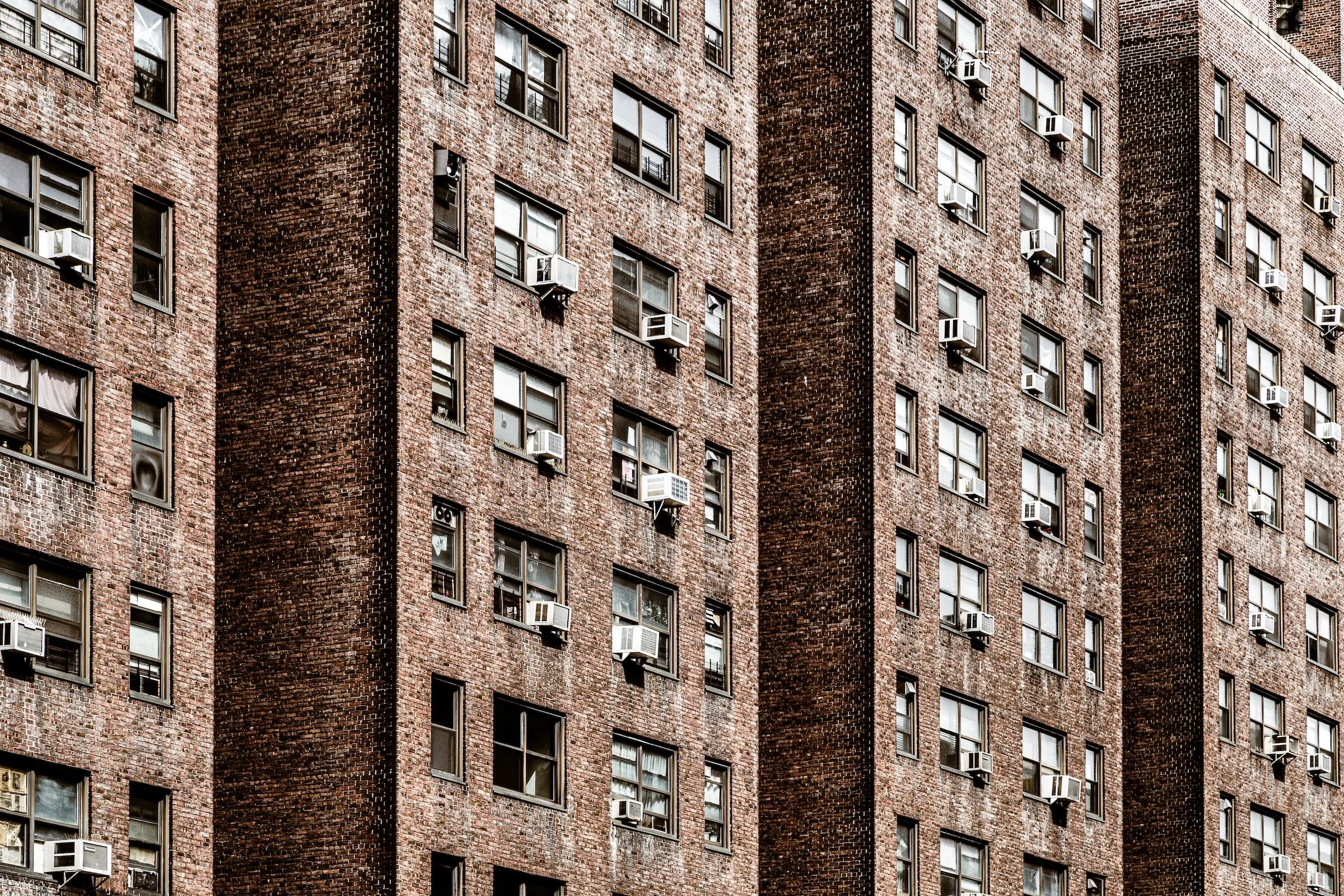 Brick becomes mass and scale: a dense field of masonry punctuated by windows and air conditioners like stitches. The texture works because it’s consistent—an enormous surface rendered clearly enough that the viewer can feel the building’s weight.