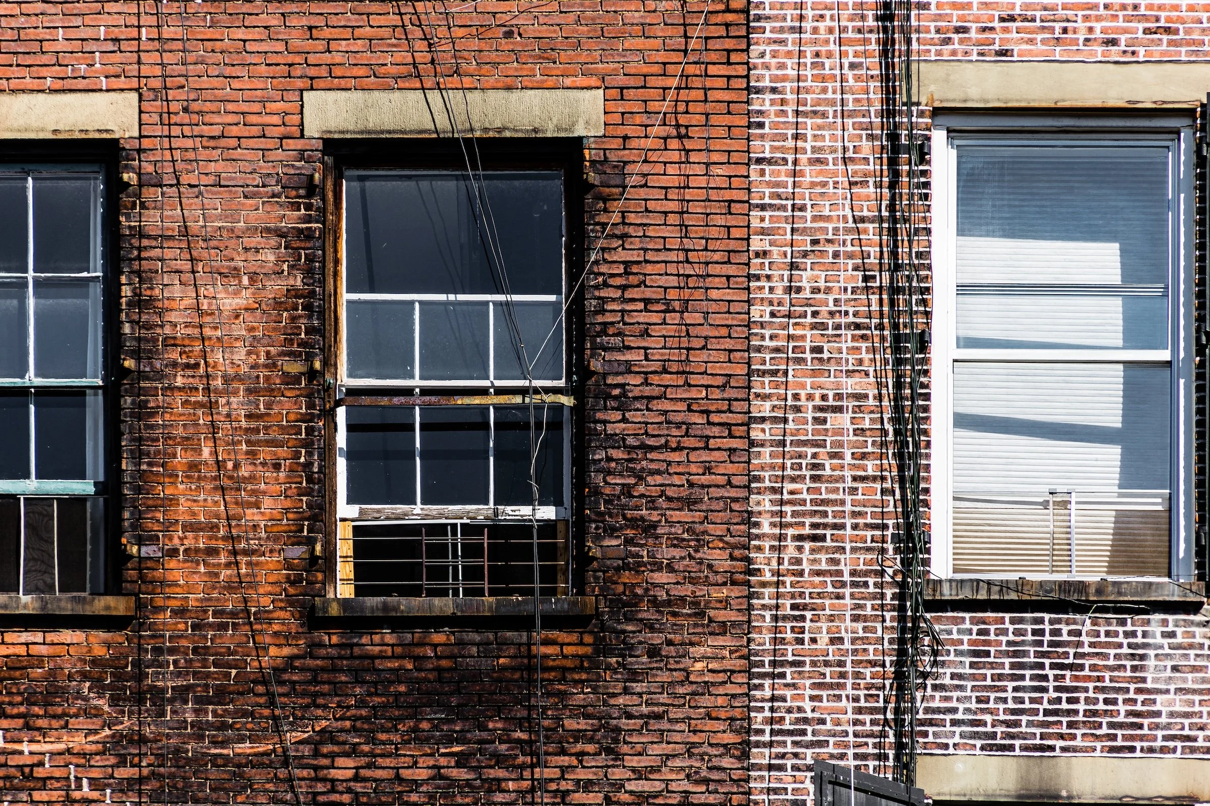 This facade reads like an industrial quilt: repeated windows, dark vent panels, and subtle stains that give the brick a lived-in atmosphere. The strength is in the grid—texture plus repetition creating a calm, mechanical rhythm.