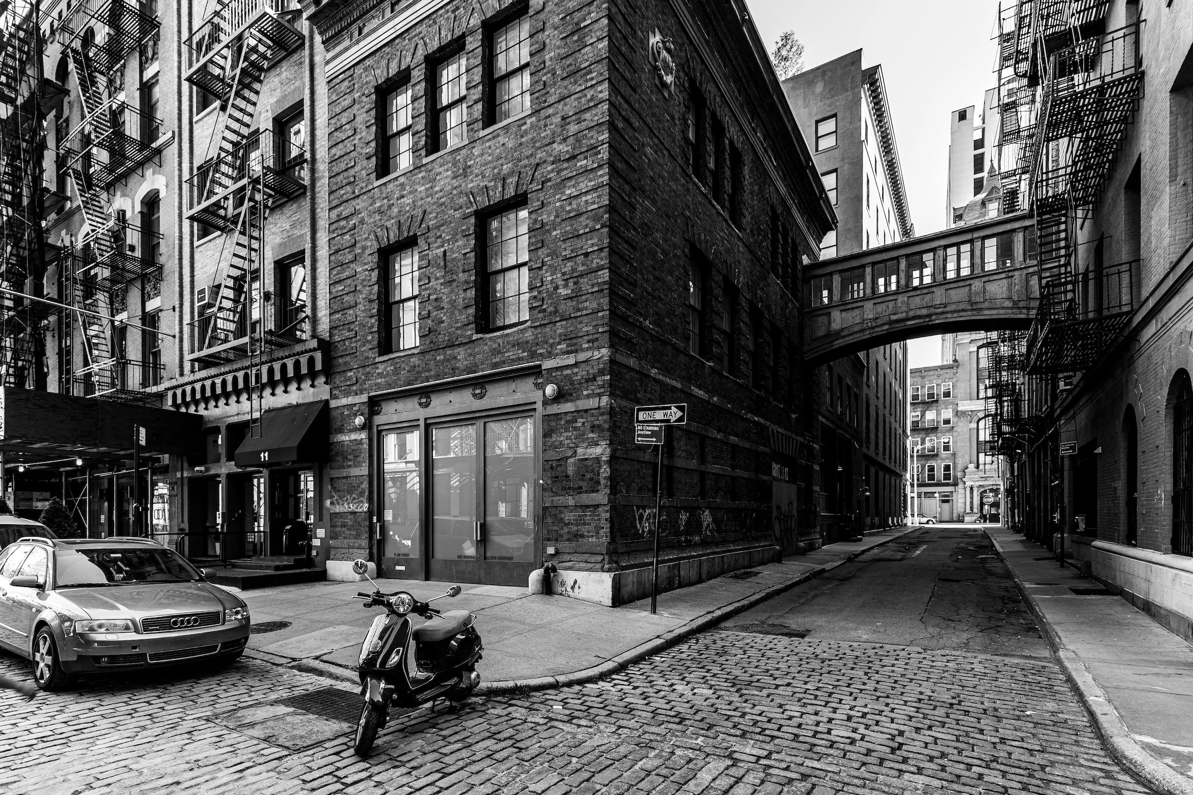 A corner is where the city reveals its hidden structure: two streets meet, two facades collide, a tunnel turns, an overpass curves, a storefront wraps a sidewalk. With a wide lens (or simply a wide perspective choice), the frame stops being a window and becomes a room—and the viewer feels held inside it.