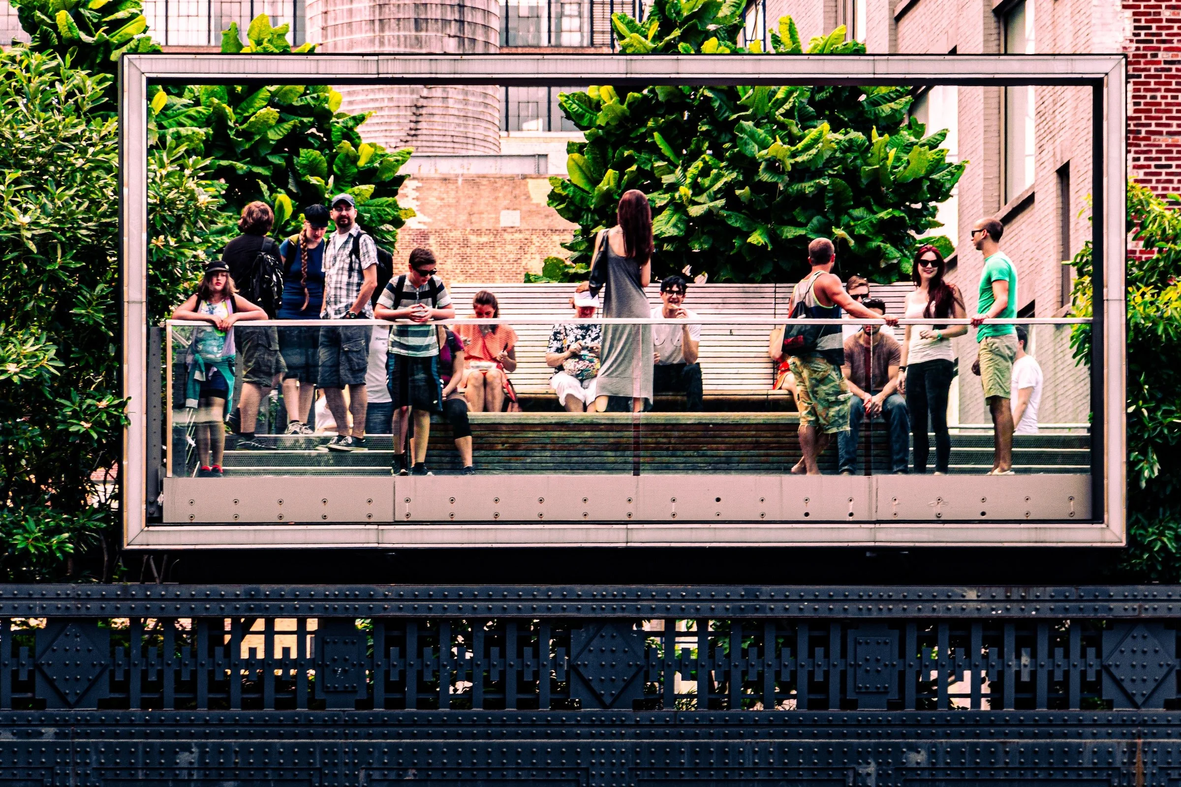 A view broken into segments by foreground structure: the skyline becomes something you “see through,” like a picture assembled from cutouts. The crowd below adds scale and human texture to the geometry.