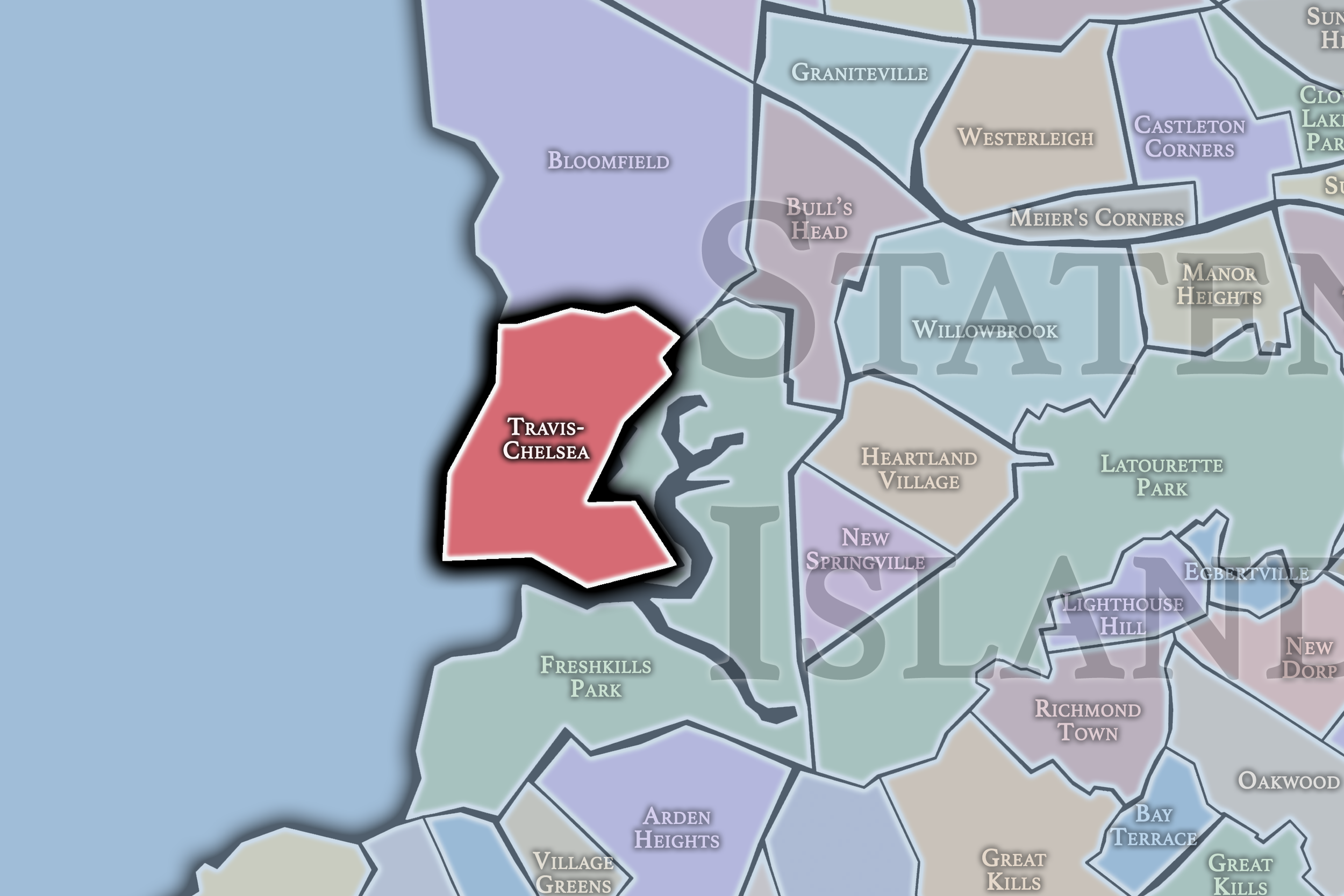 Bounded by South Avenue to the north, Travis Avenue to the northeast, Freshkills Park to the east and south, and the Arthur Kill to the west, Travis–Chelsea occupies the inland western flank of Staten Island—a landscape defined by marshland edges, tidal creeks, and broad stretches of reclaimed meadow. The neighborhood sits at the western end of Victory Boulevard, where the road terminates at the Travis Bridge spanning Fresh Kills Creek. To its west, the shoreline of the Arthur Kill marks the borough’s frontier with New Jersey.